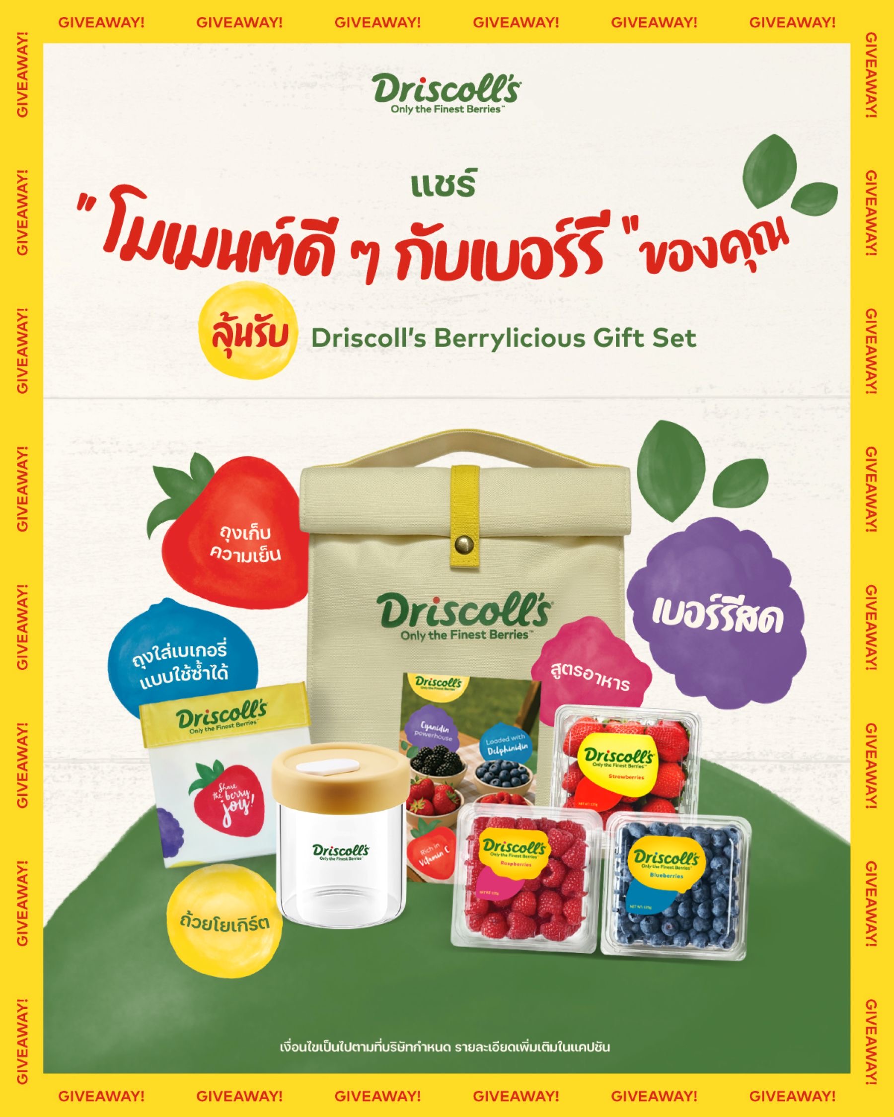 Driscoll’s ขอเชิญชวนทุกท่านมาร่วมสนุก และแบ่งปันความอร่อยจากเบอร์รี่คุณภาพเยี่ยม เพื่อลุ้นรับของรางวัล Driscoll’s Berrylicious Giftset ภายในเซ็ตประกอบด้วย กระเป๋าเก็บความเย็นสุดเก๋ ถ้วยโยเกิร์ตถุงใส่ขนมที่สามารถรียูสได้ คู่มือรวมสูตรเบอร์รี และเบอร์รีสดจาก Driscoll’s