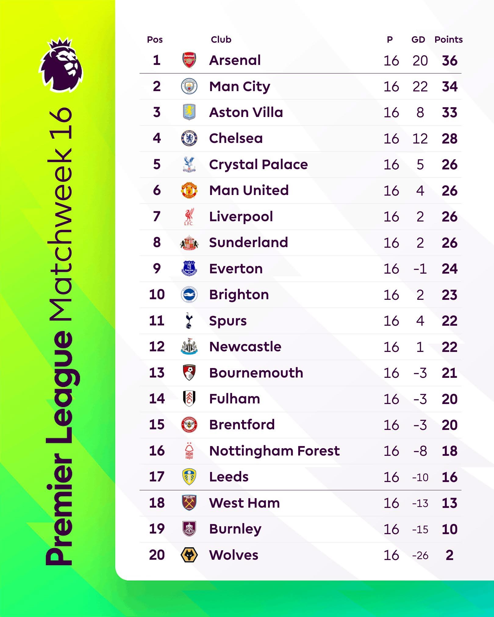 ตารางคะแนนพรีเมียร์ลีกอังกฤษฤดูกาล 2025-26 Week 16