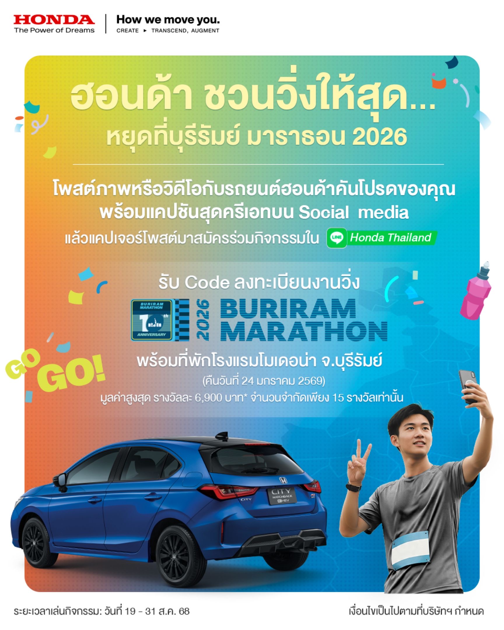 ฮอนด้าชวนลูกค้าฟิตร่างกายกับกิจกรรม “ฮอนด้าชวนวิ่งให้สุด…หยุดที่ บุรีรัมย์ มาราธอน 2026” ลุ้นวิ่งฟรี ! พร้อมที่พัก 1 คืนสุดเอ็กซ์คลูซีฟ สมัครด่วนทาง LINE Honda Thailand Official Account วันที่ 19-31 ส.ค. 68 นี้เท่านั้น !