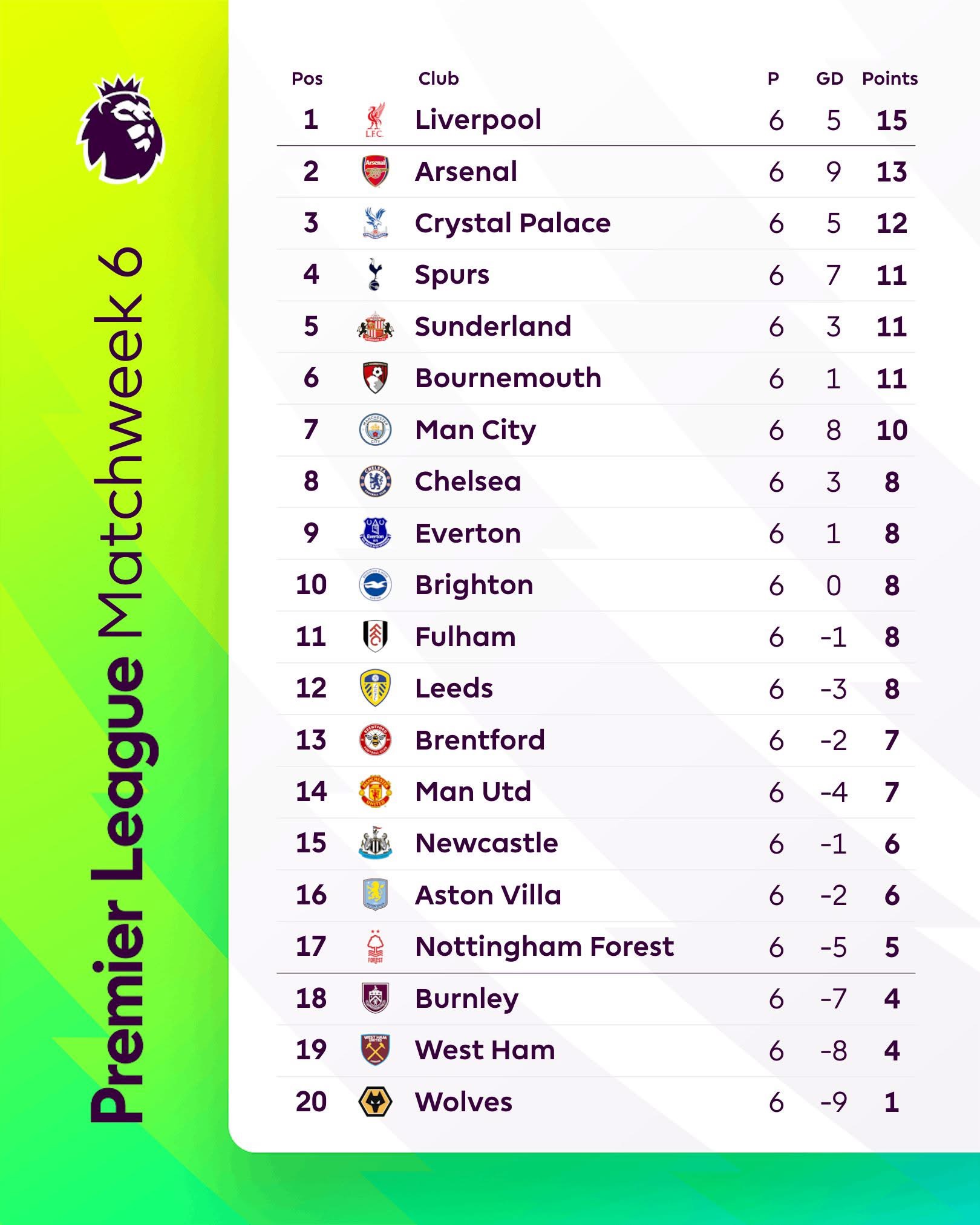 ตารางคะแนนพรีเมียร์ลีกอังกฤษฤดูกาล 2025-26 Week 6